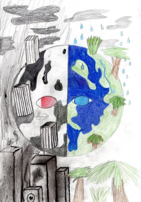 1. Gefällt mir spontan und auf zweiten und drtten Blick – der Kontrast mit schwarz/grün, beschädigt/lebend ist gut!!! ich mag das Auge im Meer – „Achtet auf unsere Welt!“