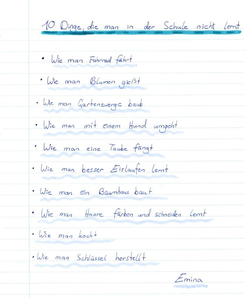 Nicht alles, was man im Leben gut brauchen kann, lernt man in der Schule. Emina sind einige Dinge eingefallen: