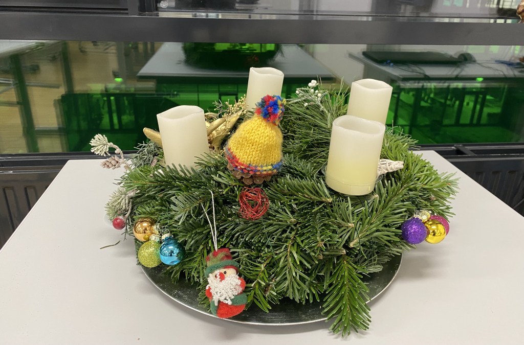 Auf unserer Expedition durch das Schulhaus, auf der Suche nach Weihnachtlichem, haben wir in der 1D diesen schrullig-süßen Mützen-Adventskranz entdeckt:
